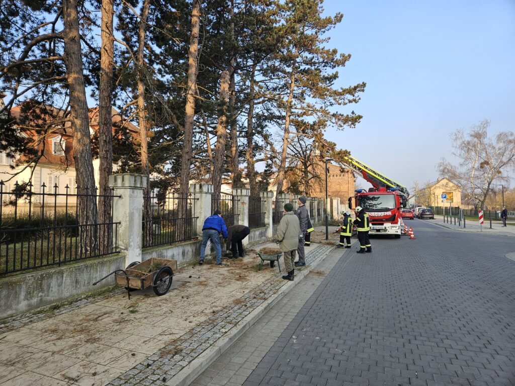 Mit enormer Unterstützung durch die Freiwillige Feuerwehr Barby konnten die in ihrer Standsicherheit gefährdeten Kiefern gefällt werden. Insgesamt wurden 10 Bäume gefällt. Vier Bäume konnten erhalten bleiben. Die Fällgenehmigung dazu wurde im November 2024 erteilt.