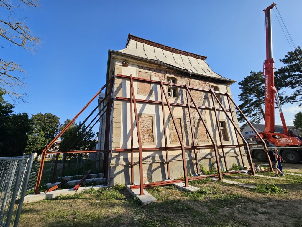 Aufbau der temporären Fassadenabstützung. Nur so kann das Mauerwerk gestützt werden, wenn im inneren die neuen Decken eingebaut werden.
